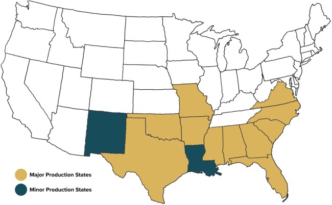 Major peanut producing states are grouped into three regions. For 2014, the Southeast region (Georgia-Florida-Alabama-Mississippi) produced approximately 65 percent of all USA-grown peanuts. The Virginia-Carolina region (Virginia-North Carolina-South Carolina) accounted for nearly 13 percent of all USA-grown peanuts. The Southwest region (Texas-Oklahoma-New Mexico-Arkansas) grew more than 17 percent. Louisiana and Missouri together produced less than one percent of total USA-grown peanuts.