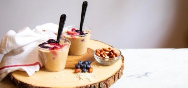 Portion with a #8 scoop into 10 to 12 oz. cups. Top each portion with ½ cup frozen mixed berries. Cover and refrigerate overnight.